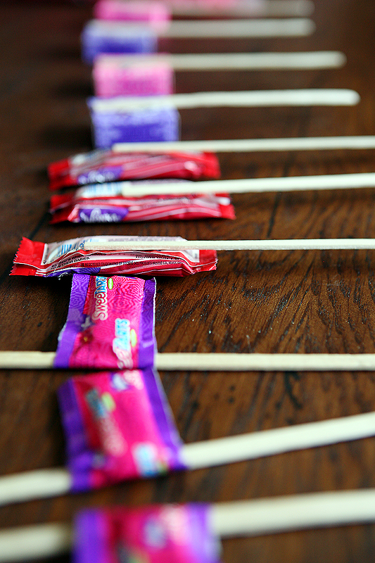 -tuck your crinkled shreds around the base of the sticks and behind the candy. don’t forget the back too.