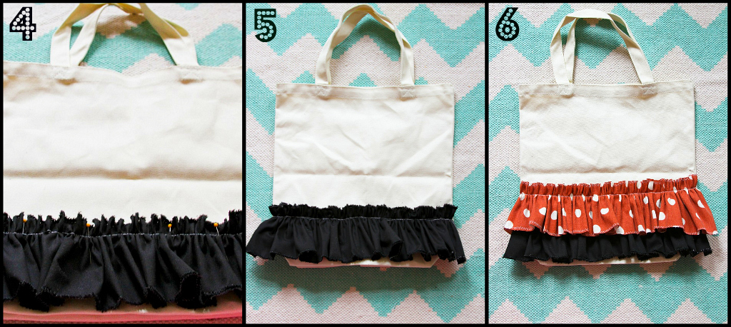 Step 6: Continue to pin and sew your ruffles onto your tote with all 4 of your ruffles.